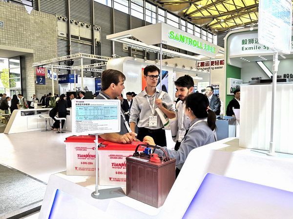在上海新国际博览中心W5馆D2展位,现代、简洁、科技感十足的天能展区人山人海,吸引了来自德、美、俄、英、意、日、韩等国家和地区客户驻足参观。
